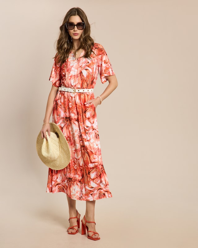 Dieses Maxikleid verwandelt jeden Moment in einen besonderen Auftritt. Der V-Ausschnitt schmeichelt Ihrer Silhouette, während die Flügelärmel für eine luftige Leichtigkeit sorgen. Der gesmockte Bund passt sich Ihren Bewegungen an und sitzt dabei wunderbar bequem. Praktische Einschubtaschen machen das Modell alltagstauglich. Die fließende Maxilänge umspielt Ihre Figur auf vorteilhafte Weise. Ein Begleiter, der Sie mühelos durch warme Tage trägt.