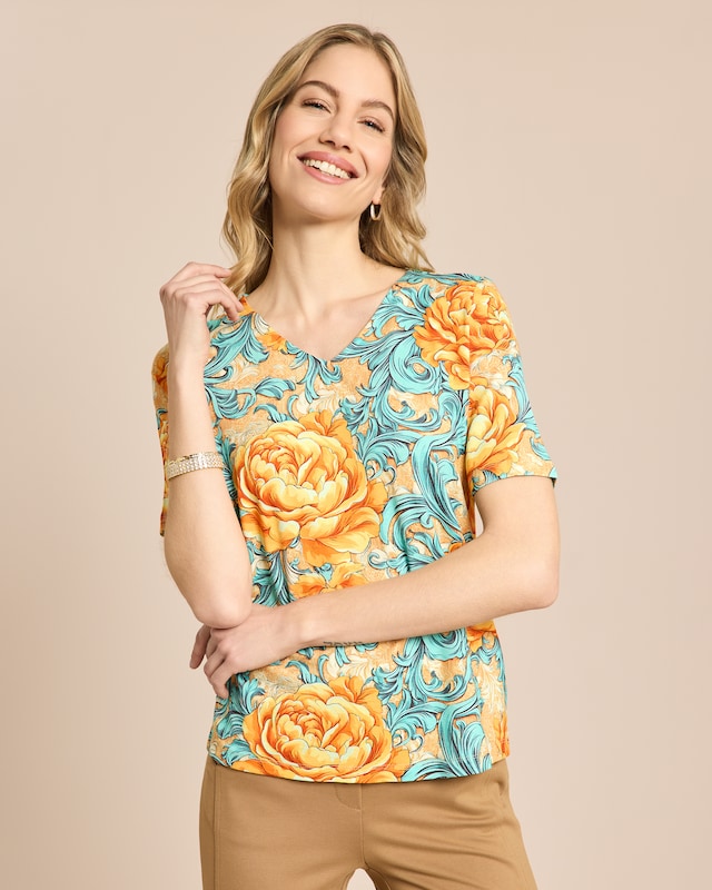 Lassen Sie Ihren Stil erblühen! Dieses Shirt mit floralem Ornamentprint verzaubert durch sein ausdrucksstarkes Design. Der V-Ausschnitt und die kurzen Ärmel sorgen für eine feminine Silhouette, während der klassische Schnitt Ihnen Bewegungsfreiheit schenkt. Mit einer Rückenlänge von ca. 62 cm in Größe 38 passt es perfekt zu Ihrer Figur. Das atmungsaktive Material aus Viskose und Elasthan schmiegt sich angenehm an Ihre Haut und behält auch nach vielen Wäschen seine Form. Ein Allrounder, der Ihren Kleiderschrank bereichert und Ihren Alltag mit einem Hauch von Eleganz verschönert.