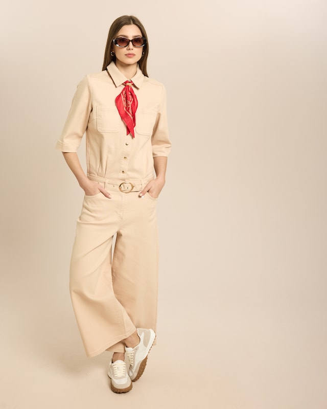 Dieser Overall vereint lässige Vielseitigkeit mit durchdachten Details, die Ihren Tag bereichern. Der klassische Hemdblusenkragen und die praktischen Druckknöpfe sorgen für unkompliziertes An- und Ausziehen, während die Brusttaschen funktionale Akzente setzen. Der mitgelieferte Gürtel betont die Taille und lässt sich individuell anpassen. Dank der Eingriffstaschen haben Sie alles Wichtige griffbereit. Das ausgestellte Bein verleiht eine entspannte Linie und lässt sich mühelos zu Sneakers oder Stiefeln kombinieren. Die Gesäßtaschen runden das Design ab. Ob beim Einkaufsbummel, im Garten oder beim Treffen mit Freundinnen – dieser Overall wird schnell zu Ihrem Lieblingsbegleiter, der Ihnen Bewegungsfreiheit und mühelosen Stil schenkt.