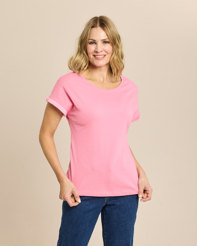 Dieses T-Shirt verzaubert mit seinem verspielten Charme. Die Fransen-Deko am Armausschnitt verleiht dem Klassiker eine besondere Note. Aus reiner Baumwolle gefertigt, schmiegt es sich angenehm an die Haut und sorgt für ein luftig-leichtes Tragegefühl. Der klassische Schnitt mit Rundhalsausschnitt und Halbarm passt zu jeder Figur. In Größe 38 misst die Rückenlänge ca. 63 cm. Ob zum Rock oder zur Jeans - dieses Shirt ist der perfekte Begleiter für entspannte Sommertage.