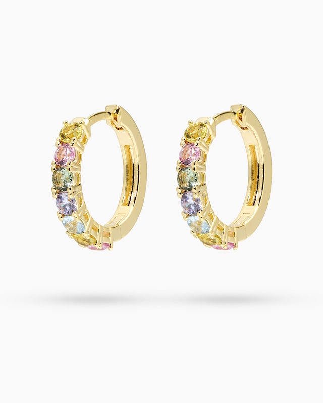 Farbenfrohes Funkeln für jeden Tag: Diese Creolen von Jana Ina setzen auf lebendige Farbakzente und zeitloses Design. Die facettierten Zirkonia in verschiedenen Farbnuancen – von zartem Rosa über strahlendes Gelb bis hin zu elegantem Blau und Violett – sind in Krappenfassungen gefasst und sorgen für ein faszinierendes Farbenspiel bei jedem Lichteinfall. Das hochglanzpolierte Metall ist wahlweise gelbvergoldet oder rhodiniert und unterstreicht die brillante Ausstrahlung der synthetischen Kristalle. Mit einem Durchmesser von ca. 1,8 cm sind die Creolen perfekt dimensioniert, um Ihrem Look eine verspielte Note zu verleihen, ohne dabei aufdringlich zu wirken. Der praktische Bügelverschluss garantiert sicheren Halt und angenehmen Tragekomfort. Was die Qualität unserer Schmuckstücke angeht, gehen wir keine Kompromisse ein. Aus diesem Grund werden unsere Schmuckwaren von unserer Qualitätssicherung und seitens des Lieferanten strengsten Prüfprozessen unterzogen. Unter anderem beinhalten unsere Prüfprozesse Prüfungen auf Konformität mit den Bestimmungen der Schweizer Edelmetallkontrollgesetzgebung. Ein Schmuckstück, das Farbe in Ihren Alltag bringt und Sie mit seinem fröhlichen Charme begeistern wird.