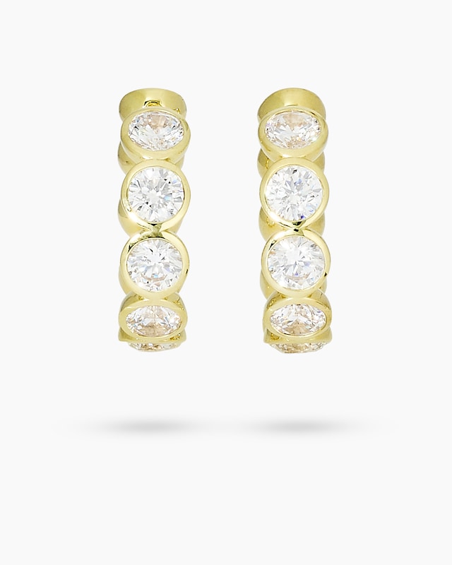 Lassen Sie Ihren Look mit diesen exquisiten Creolen erstrahlen. Die von Eva-Maria Pfeffinger persönlich entworfenen Ohrringe vereinen zeitlose Eleganz mit modernem Design. Jeder der 10 sorgfältig ausgewählten Zirkonia im Brillantschliff ist präzise in einer Zargenfassung eingebettet und reflektiert das Licht in faszinierender Weise. Das hochglanzpolierte Sterlingsilber 925 unterstreicht die Brillanz der Steine und verleiht den Creolen einen luxuriösen Glanz. Mit einem Durchmesser von 1,84 cm sind sie der perfekte Blickfang für jede Gelegenheit. Wählen Sie zwischen einer gelbgold plattierten oder rhodinierten Ausführung, um Ihren persönlichen Stil zu unterstreichen. Der sichere Klappverschluss sorgt für bequemes Tragen und festen Halt. Diese in Pforzheim handgefertigten Creolen durchlaufen strenge Qualitätskontrollen und entsprechen höchsten Schmuckstandards. Ein zeitloses Accessoire, das Ihrem Outfit einen Hauch von Luxus verleiht und Sie Tag für Tag aufs Neue verzaubern wird.