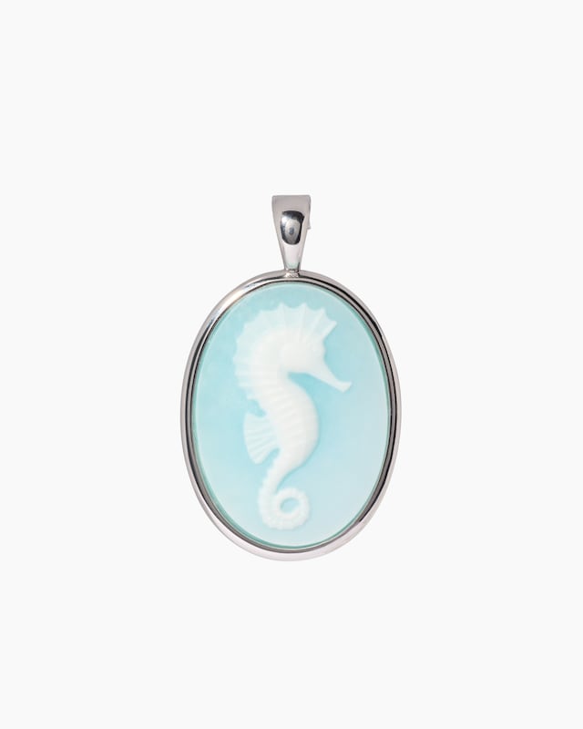 Dieser bezaubernde Clipanhänger aus der Linie Terra Opalis von Sogni d'oro vereint Eleganz und Naturschönheit auf einzigartige Weise. Im Mittelpunkt steht eine faszinierende Aventurin-Kamee mit einem kunstvoll gravierten Seepferdchen-Motiv, das in einem zarten Türkis auf weißem Grund erstrahlt. Der edle grüne Aventurin, bekannt als Stein des Glücks und der Chancen, verleiht dem Schmuckstück eine besondere Aura. Mit einem Gesamtgewicht von ca. 15 Karat ist die ovale Kamee ein wahrhaft beeindruckendes Schmuckelement. Der Anhänger selbst, gefertigt aus hochwertigem, rhodiniertem Sterlingsilber 925, umfasst die Kamee in einer eleganten Zargenfassung. Die rhodinierte Oberfläche verleiht dem Silber zusätzlichen Glanz und Schutz. Mit einer Größe von ca. 42 x 25,5 mm ist der Clipanhänger ein auffälliges Statement-Piece, das dennoch durch seine filigrane Gestaltung besticht. Die Öse mit den Maßen ca. 4,9 x 3,7 mm ermöglicht das einfache Anbringen an verschiedenen Ketten oder Bändern. Dieser Anhänger ist nicht nur ein Schmuckstück, sondern ein kleines Kunstwerk, das die Schönheit der Natur einfängt und zu einem unvergesslichen Accessoire macht. Ob als besonderes Geschenk oder als Verwöhnen für sich selbst - dieser Clipanhänger von Sogni d'oro ist ein Schmuckstück, das Geschichten erzählt und Erinnerungen schafft.