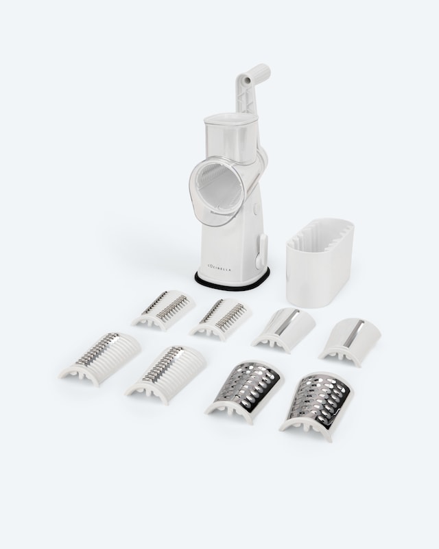 Kochen wie ein Profi: Mit dieser hochwertigen Trommelreibe von Cucinella macht das tägliche Kochen noch mehr Spaß. Das vielseitige Angebot enthält 5 verschiedene Klingen, mit denen Sie je nach Wunsch reiben, hacken und schneiden können - und das auch noch in Rekordgeschwindigkeit. Damit die Trommelreibe sicher steht, ist sie an der Unterseite mit einer Antirutschfunktion ausgestattet. Nach Gebrauch kann die Reibe von Hand oder in der Spülmaschine gereinigt werden. Ein vielseitiges und zeitsparendes Allround-Gerät für schnelle und saubere Schnitte.
