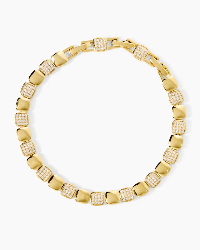 Ein Armband, das mit seinem brillanten Funkeln jeden Moment zu etwas Besonderem macht. Dieses elegante Schmuckstück besticht durch 224 facettierte Zirkonia-Steine in strahlendem Weiß, die im Pavé gefasst sind und bei jedem Lichteinfall ein faszinierendes Glitzerspiel entfalten. Das hochglanzpolierte Nichtedelmetall ist wahlweise gelbvergoldet oder palladiumbeschichtet erhältlich und verleiht dem Design eine luxuriöse Note. Die Zirkonia-Steine sind rund geschliffen und sorgen für einen beeindruckenden Brillanz-Effekt, der Ihr Handgelenk auf unvergleichliche Weise schmückt. Mit einer Länge von ca. 17,5 cm und einer zweifachen Verlängerungsmöglichkeit um je 2 cm passt sich das Armband perfekt an Ihr Handgelenk an. Die praktische Faltschließe sorgt für sicheren Halt und angenehmen Tragekomfort. Was die Qualität unserer Schmuckstücke angeht, gehen wir keine Kompromisse ein. Aus diesem Grund werden unsere Schmuckwaren von unserer Qualitätssicherung und seitens des Lieferanten strengsten Prüfprozessen unterzogen. Unter anderem beinhalten unsere Prüfprozesse Prüfungen auf Konformität mit den Bestimmungen der Schweizer Edelmetallkontrollgesetzgebung. Ein zeitloses Accessoire, das Ihren Look mit funkelnder Eleganz vollendet.